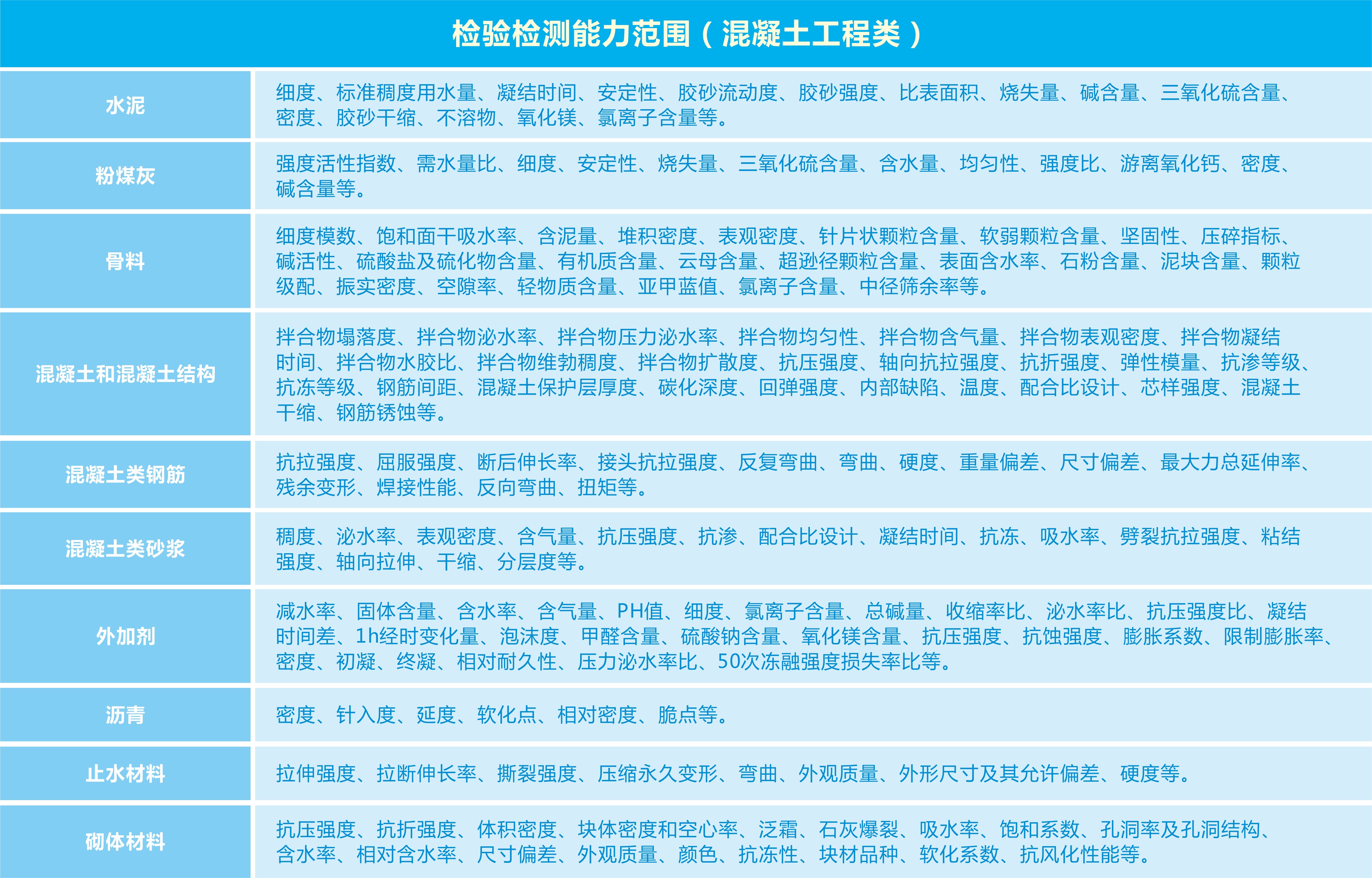 水工混凝土工程質(zhì)量檢測(cè)包含:原材料質(zhì)量檢測(cè)、混凝土拌合物性能檢測(cè)、混凝土物理力學(xué)性能檢測(cè)、混凝土耐久性能檢測(cè)、現(xiàn)場(chǎng)混凝土質(zhì)量檢測(cè)、砂漿性能檢測(cè)。